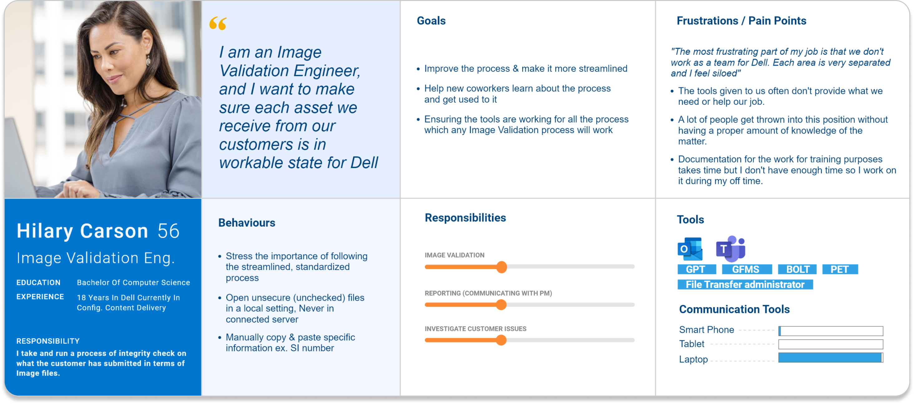 to understand user’s process, behaviors, and attitutdes. The research included, but was not limited to, multiple 1:1 user interviews, user shadowing, focus group studies, and contextual inquiries.