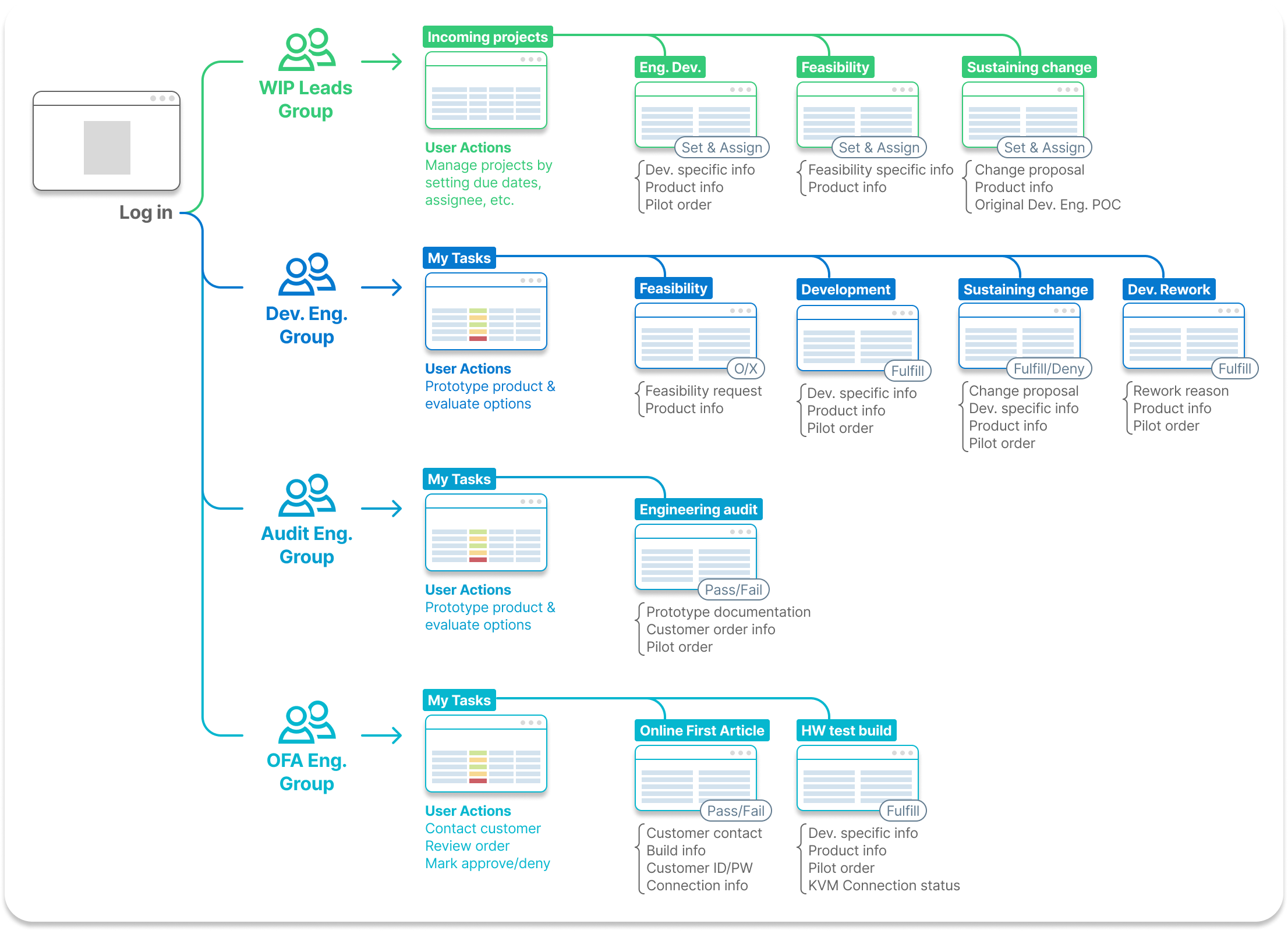Individual users required different sets of information and functions based on their roles. In the legacy process, users had to spend time foraging for the materials they need. I hypothesized that providing personalized materials to the users will reduce unecessary use of time. I have put users in 8 groups based on their roles and divided project into multiple tasks providing focused view.